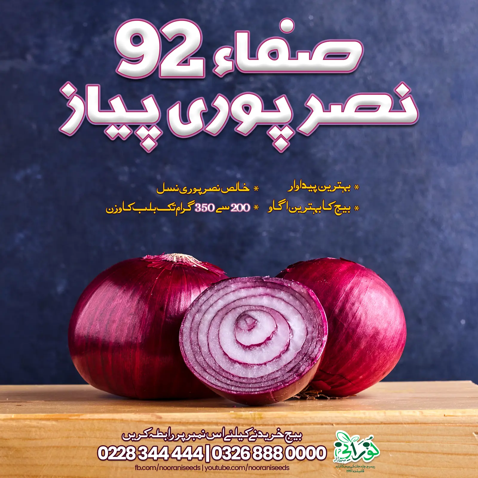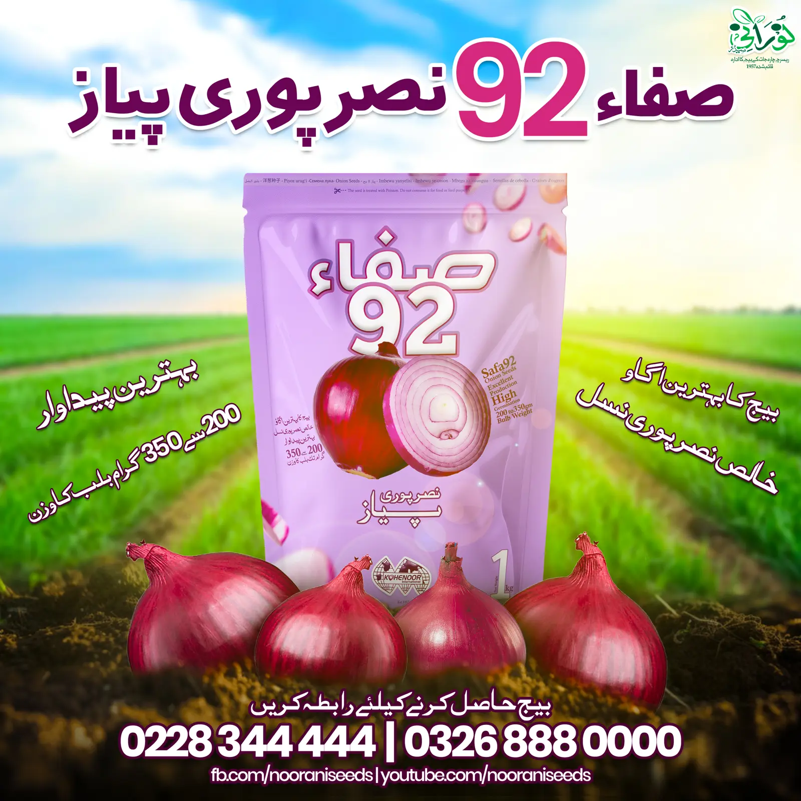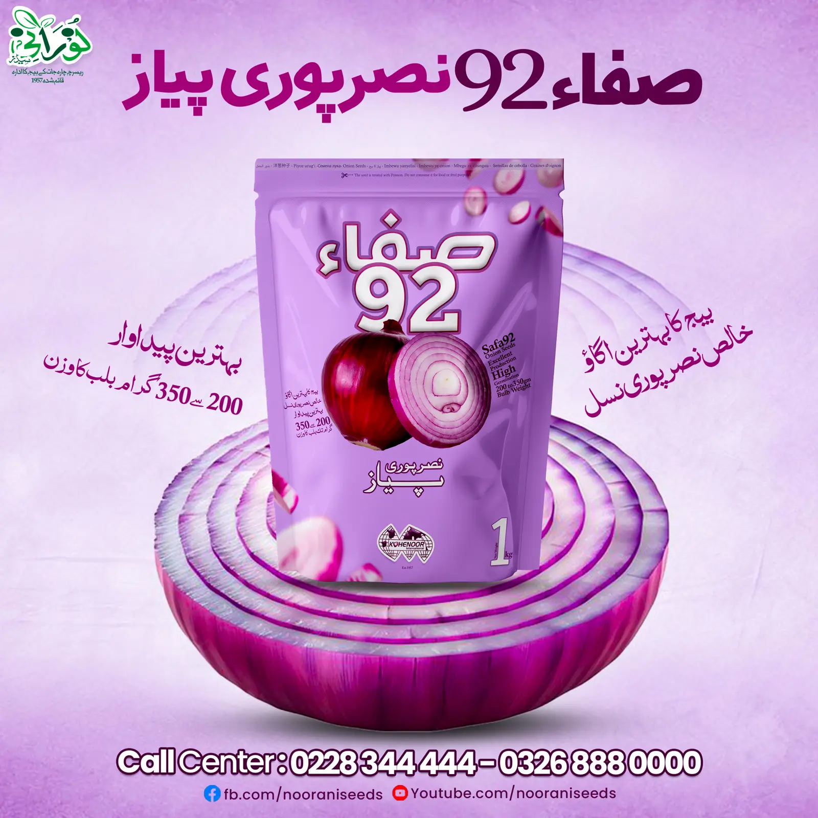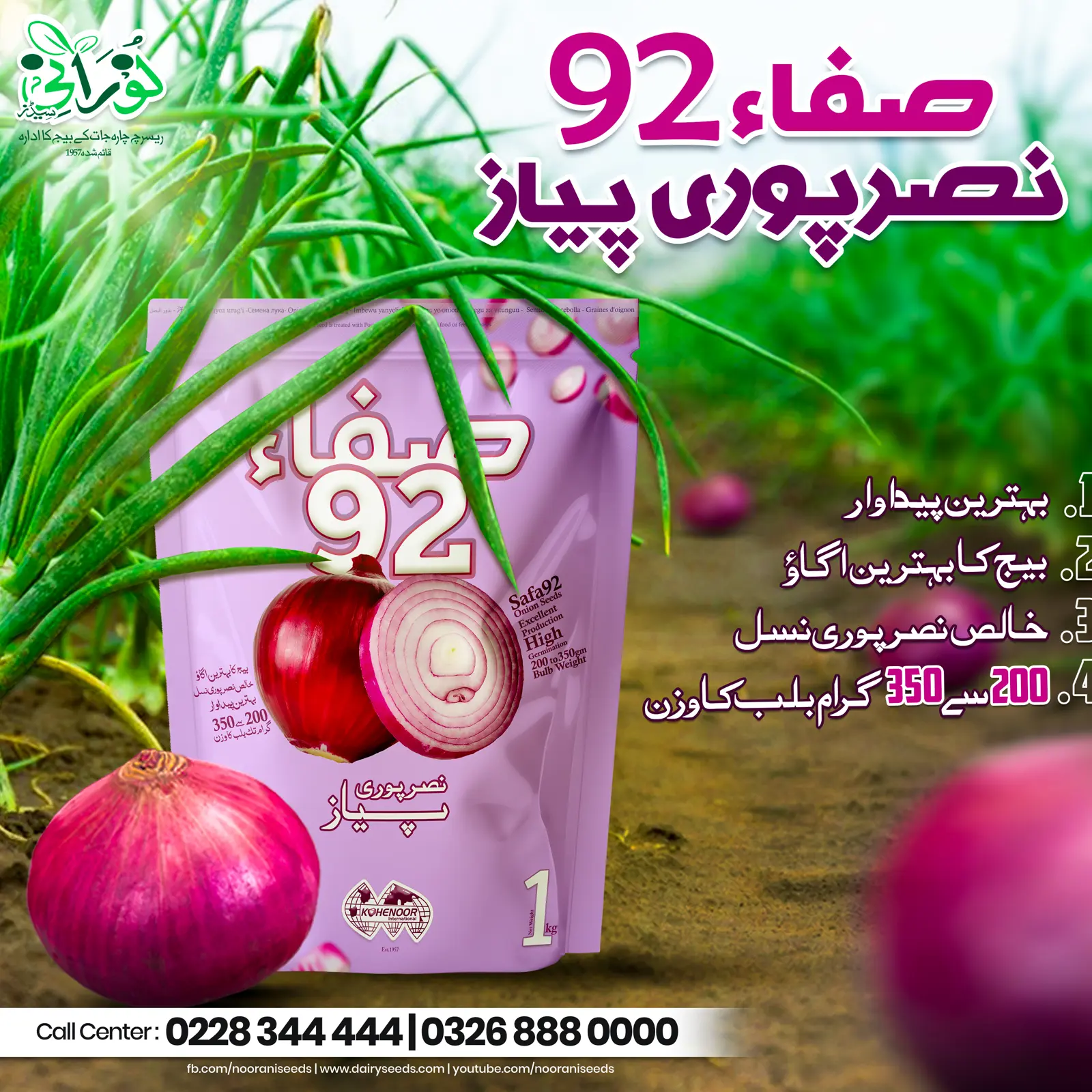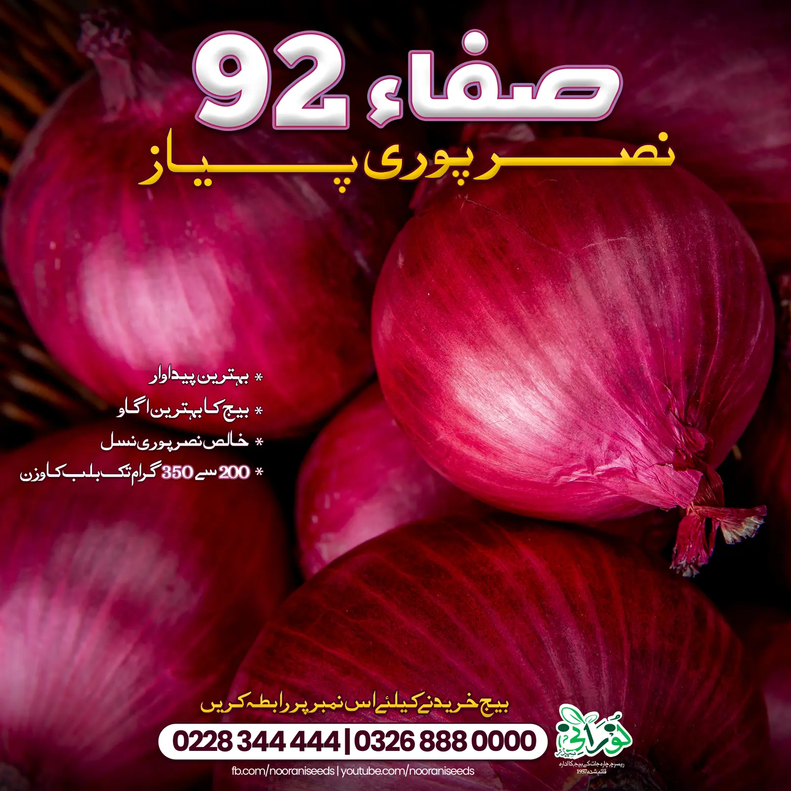 صفا 92 نصرپوری پیاز کا بیج ایک بہترین اوپن پولینیٹڈ قسم ہے جو کسانوں میں انتہائی مقبول ہے۔ یہ قسم یکساں اور گول سے قدرے چپٹے بلب تیار کرتی ہے، جن کا وزن 200 سے 350 گرام ہوتا ہے۔ اس کے بلب خوبصورت رنگ، مضبوط ساخت اور بہترین اسٹوریج صلاحیت رکھتے ہیں۔ یہ مختلف موسمی حالات میں اچھی کارکردگی دیتی ہے اور کٹائی کے بعد بھی مارکیٹ کی طلب پوری کرنے کی صلاحیت رکھتی ہے۔